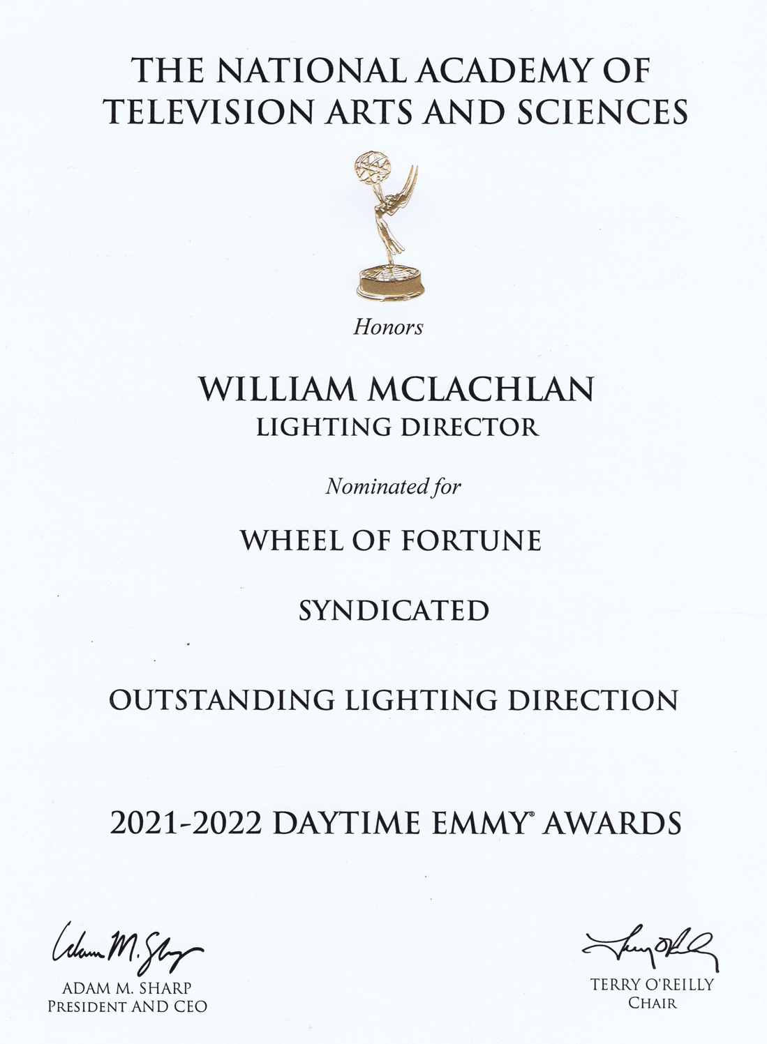 TELEVISION SPECIALS, SERIES, AND LIVE BROADCASTS "Wheel Of Fortune" (Syndicated, 2012-2024) (1) Lighting Director/Programmer. "Jeopardy" (Syndicated, 2012-2025) (1) Lighting Director/Programmer. ABC's "CMA Festival - Country's night to rock" (2013-2018) Lighting Director/Programmer. PBS's "Postmodern Jukebox - The New Classics" Lighting Designer. (2017) PBS's "Rethinking High School with Soledad O'Brien" Lighting Designer. (2017) PBS's "Alan Cumming Sings Sappy Songs" Lighting Designer (2016). SPIKE TV's "Lip Sync Battle" (Season 2) Lighting Director/Programmer.
